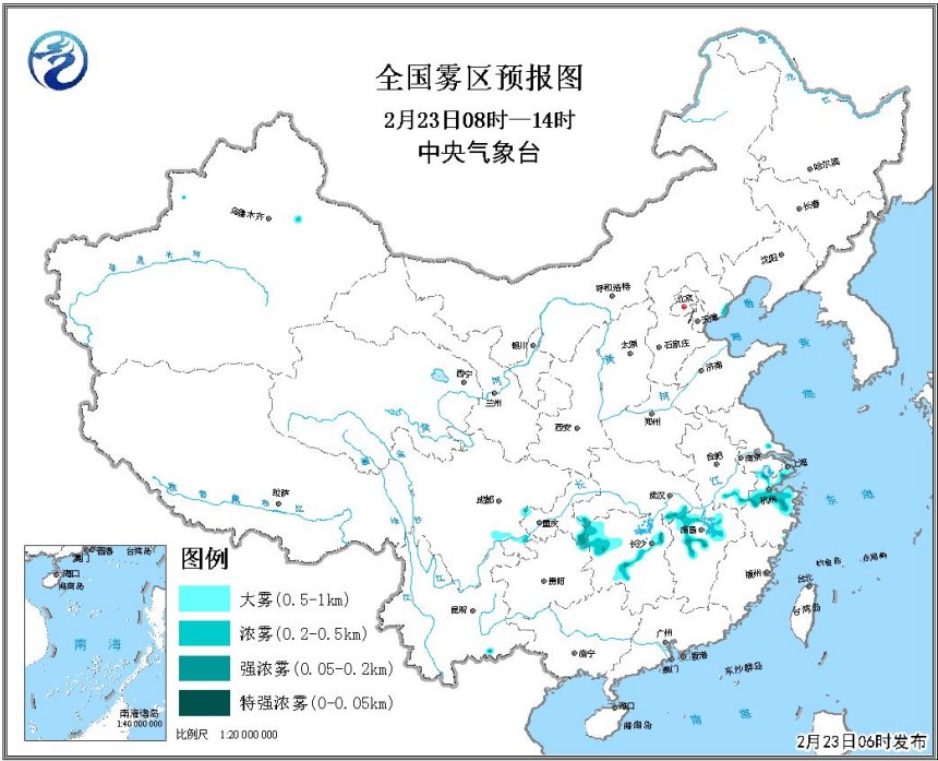 人民网北京2月23日电 据中央气象台网站消息,中央气象台2月23日06时继续发布大雾黄色预警: