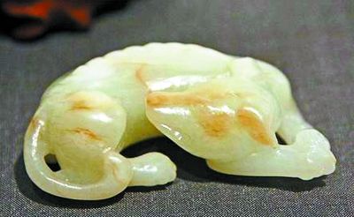 狗造型的玉器较多出现,应在汉唐以后。一是汉代佩玉多了起来,狗形象也随之出现。唐代以来,玉器不再为王室独有,逐步走向民间。玉器大量地表现出当时的民风、民俗文化。玉狗的形象也随之大量出现。大英博物馆收藏的一件圆雕唐代玉狗,做伏卧状,神态自然松弛,项下有悬挂铃铛的项圈,像是一只被驯养的家狗。宋代以后,玉器表现出更多的是民间的生活场景;狗的形象也是多姿多彩,造型不仅仅有片状的、伏卧状的,还有具体生活场景的圆雕刻画。首都博物馆收藏的童子架鹰戏犬饰件,虽然没有苏轼“左?;疲仪娌?,锦帽貂裘,千骑卷平冈”的气势,但这件玉器造型就是当时架鹰牵狗的生活图景的展现。明清时期,狗的形象走进了文人的书房,被雕刻成了镇纸,成为文人书案上的实用器具。在豪门大家的书案、箱柜上,玉狗或坐或卧已经成为普遍的陈设器物。这一时期,玉狗形象也走进了皇宫,成为宫廷陈设与收藏品。此时期,玉狗已经登堂入室了。