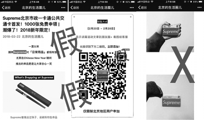 从前天开始,这篇名为“Supreme北京市政一卡通公交卡首发,1000张免费申领,潮爆了”的文章便在微信朋友圈广泛流传。文章称,美国潮流品牌Supreme在中国新年期间带来惊喜,与北京一卡通公司合作推出一款公交卡??嫔嫌∮衅放频腖OGO标识,“在地铁站亮出它时,一定能成为大家的焦点”。