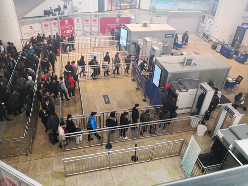 在北京某高铁站一进站口,春运前夕的候车乘客挤满了隔离栏列成的“九曲十八弯”,等待安检长队中的旅客熙熙攘攘。而旁边封闭的安检通道上,两台安检设备闲置。人流队伍日渐拥挤,有旅客因为等待不及,急于进站,与安检人员发生争执。