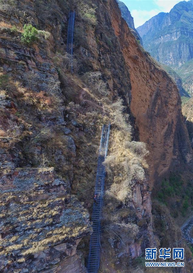 这是四川凉山州昭觉县阿土列尔村的钢梯局部一景(2017年4月13日摄)。新华社记者 刘坤 摄