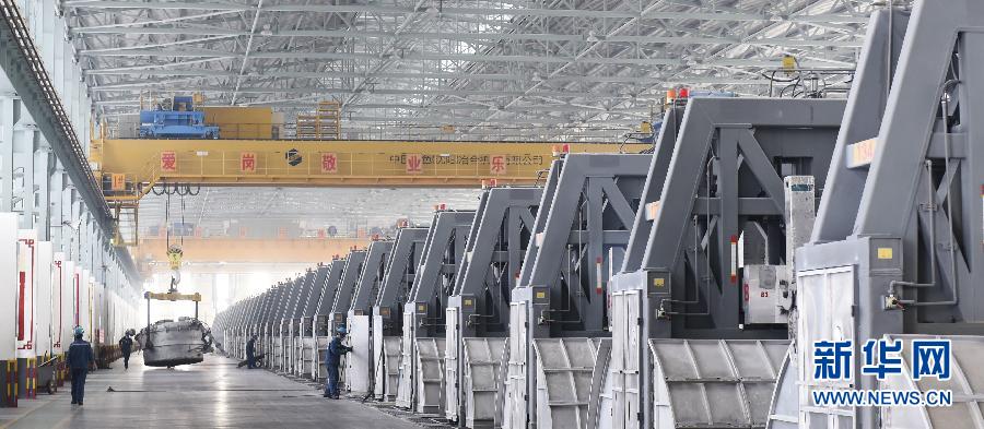 2月26日,山东魏桥铝电有限公司工人在600kA铝电解槽车间调运铝水。新华社发(董乃德 摄)