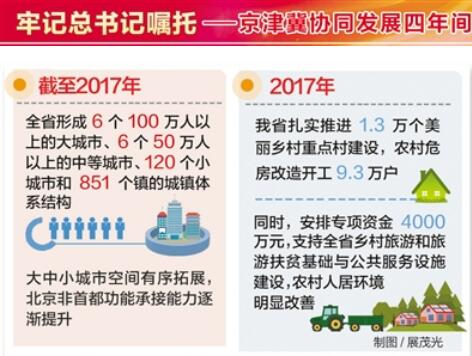 京津冀协同发展战略实施四年来,我省抢抓这一历史机遇,围绕《京津冀协同发展规划纲要》对河北建设新型城镇化与城乡统筹示范区的定位,突出新型和统筹两大主题,以人的城镇化为核心,以城乡发展一体化为导向,瞄准问题补短板,全省城镇空间布局更加优化,城乡发展日趋协调。
