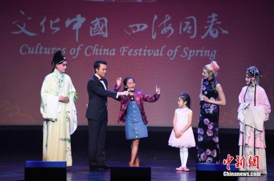 当地时间2月25日晚,2018年“文化中国·四海同春”新春文艺晚会在美国洛杉矶举行,为中美民众带来新春问候。图为昆曲名角现场指点华人小朋友唱功。中新社记者张朔摄