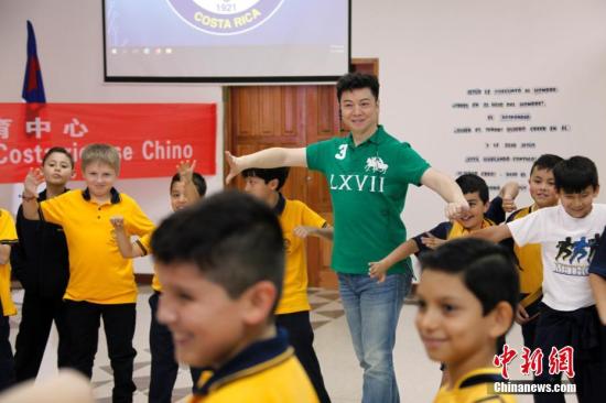 当地时间2月21日,参加中国国侨办组织的2018年“文化中国·四海同春”北美艺术团慰侨访演活动的几位艺术家及演职人员,来到哥斯达黎加首都圣何塞的中哥文化教育中心课堂,与师生们交流。图为京剧梅派传人胡文阁(绿衣者)向孩子们示范京剧基本功。中新社记者余瑞冬摄