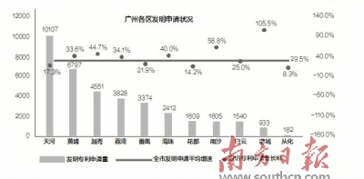 黄埔区、广州开发区作为高新技术产业的聚集区,科技创新成为该区产业升级的驱动力,连续两年发明申请量增长率高于全市平均水平。众多技术密集型的企业成为“主力军”,该区共有1178家企业申请6351件发明专利,企业的发明申请量占比由88.9%提高到93.4%,“领跑”各区。