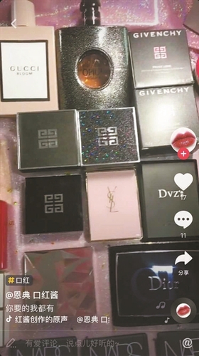 在另一个短视频平台上,一位主播展示了自己制作的各品牌口红,有几十只之多,都是知名的化妆品品牌。