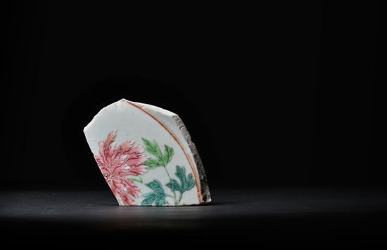 这块瓷片上有很多值得关注的细节:可以明显看到画面和色彩受到的磨损,因为所有的颜色都浮在釉的表面,并不受到釉层的?;?,青花瓷就没有这样的危险;绿色显得比较薄,而粉红色花头的部分则具有一定的厚度;绿色的叶子刻意使用了两种不同的色调,但每一种绿色只负责一片树叶,而花头则不同,可以看出粉红色努力展现的细微变化,由深至浅或由浅至深,粉红色最淡的地方,变成了白色;奇怪的是,瓷器本来就是白的,而花头的白色却又是堆在瓷器表面的一层,带有厚度,质感上也与瓷器的白色很不同。