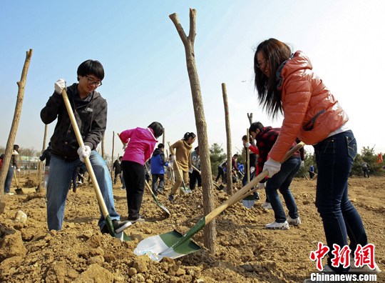 资料图:几位学生在北京顺义区参加“青年林”义务植树活动。中新社发 张浩 摄