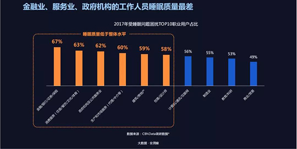 究其原因,工作压力是影响睡眠质量的“罪魁祸首”,约七成互联网用户受其影响,生活压力、环境因素、个人习惯等因素紧随其后。因此那些工作内容充满变数、承担更多责任与考核压力的行业,从业者睡眠质量普遍低于平均水平,其中金融业、服务业、政府机及公共服务业等首当其冲。