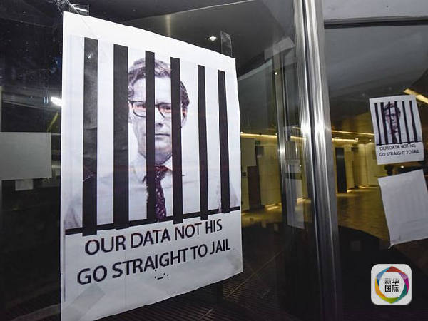 3月20日,一张抗议标语张贴在剑桥分析公司办公室玻璃上,标语上写着:“我们的数据不是他的,直接关入大牢。”(新华社发)