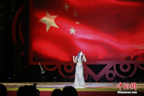 2月4日晚,2018年“文化中国·四海同春”再度唱响香江。图为国家一级演员郭蓉以其独特方式演唱《红旗飘飘》。中新社记者谢光磊摄