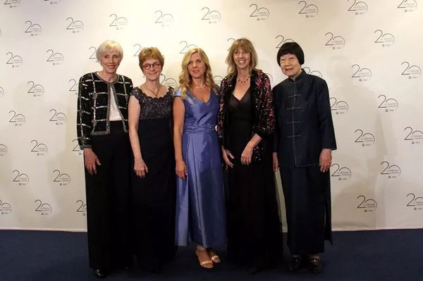 张弥曼(右一)与另外4位获颁“世界杰出女科学家奖”的科学家合影。新华社记者张曼摄
