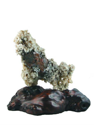 大漠石收藏风的兴起突兀而狂热,一些堪称世纪之石的现身让赏石界眼界大开。我曾在中国民间文艺家协会奇石专业委员会的展室里见过一只来自阿拉善的“和平鸽”,那是一块展翅侧飞形如真鸽子般的大漠碧玉,不但形似,大小相当,连翱翔的姿态都惟妙惟肖,假如硬要挑剔,当是支撑它飞起的那片多余的形外之石。要说大漠奇石在赏鉴方面还存有什么缺憾,那就是由于成因留下的种种多余部分,同样,一旦出现完整无缺的象形石,则立刻身价无比。