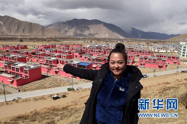 索朗央吉站在“四季吉祥村”前(3月6日摄)。新华社记者觉果摄