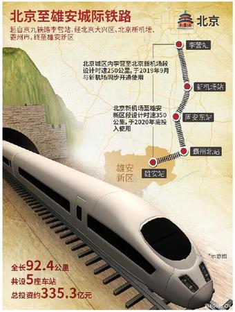 目前,从北京南开往雄安新区白洋淀站需要约1小时20分,未来京雄高铁从京九铁路李营站,经北京大兴区、北京新机场、霸州市,终至雄安新区,可实现30分钟从北京城区到达雄安新区。其中,北京城区内李营至北京新机场段设计时速250公里,将于2019年9月与新机场同步开通使用,新机场至雄安新区段设计时速350公里,将于2020年底投入使用。