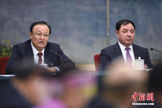 3月13日下午,十三届全国人大一次会议新疆维吾尔自治区代表团举行全体会议,审议监察法草案。图为全国人大代表、新疆维吾尔自治区主席雪克来提·扎克尔(左)发言。中新社记者侯宇摄