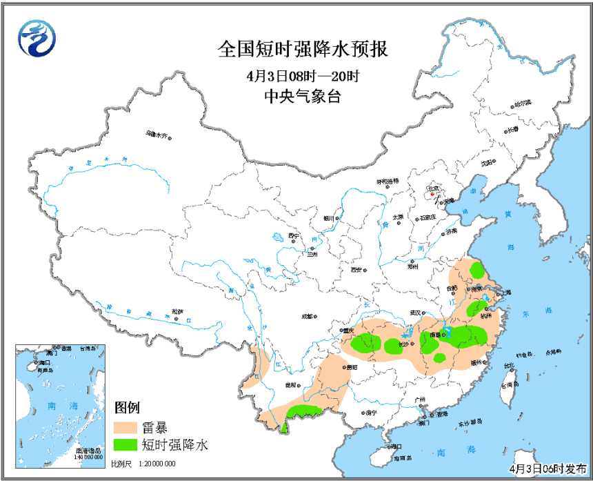 人民网北京4月3日电 据中央气象台网站消息,预计4月3日08时至4日08时,云南南部、贵州北部、重庆南部、湖南北部、江西中北部、江苏东部、浙江西部及东北部、福建西北部等地的部分地区有短时强降水天气,小时雨强20-40毫米,局地可能超过50毫米;此外,贵州西南部及东北部、重庆东南部、湖南北部、江西中东部等地的局地可能伴随有雷暴大风或冰雹天气。