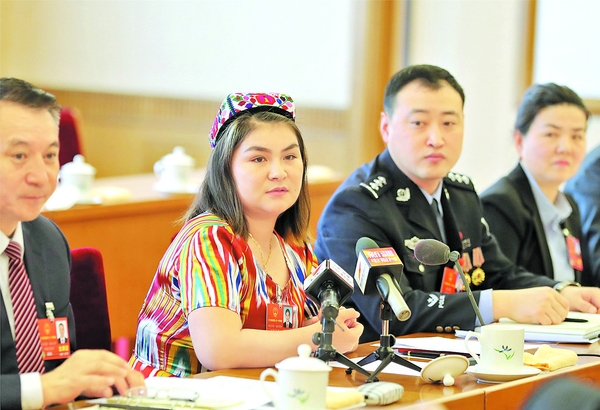 3月6日,出席十三届全国人大一次会议的新疆代表团分组审议政府工作报告。全国人大代表、于田县兰干乡民政社会保障事务所干部如克亚木·麦提赛地(左)围绕健全社会救助体系等发言?!醣颈钦叽拗炯嵘?/p>