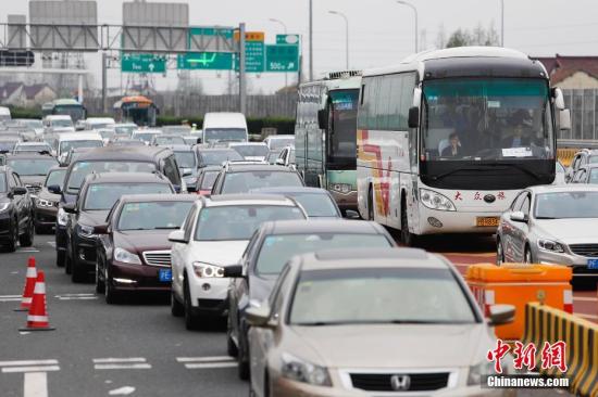4月5日,上海迎来出行高峰,在中环线通往G1501(上海绕城高速公路)高东收费站,车辆正在排队等待通行。 中新社记者 殷立勤 摄