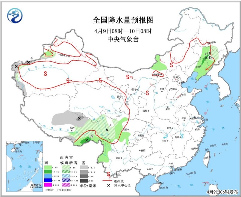 4月10日08时至11日08时,新疆北部高海拔地区、内蒙古东北部、黑龙江中北部、青海西南部等地有小到中雪或雨夹雪,局地有大雪;新疆北部、东北地区中南部、西藏东南部、西南地区东南部、江南中西部、华南西北部等地有小到中雨,局地大雨。新疆北部和东部、内蒙古大部、华北大部、东北地区中南部、山东半岛等地有4~6级风;南疆盆地、内蒙古中西部、华北北部等地的部分地区有扬沙或浮尘天气(见图3)。