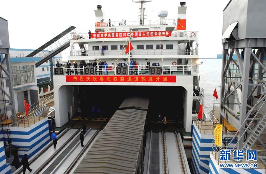 2003年1月7日,在粤海铁路北港码头,一列货运火车通过铁路栈桥徐徐开进??吭诼胪返目绾6陕稚稀N夜谝惶蹩绾L吩梁L返比湛?海南从此结束与大陆不通火车的历史。 新华社记者周文杰摄