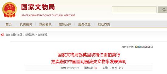 国家文物局网站4月10日消息,刚刚,国家文物局发出《关于英国坎特伯雷拍卖行拍卖疑似中国圆明园流失文物事的声明》,声明如下:
