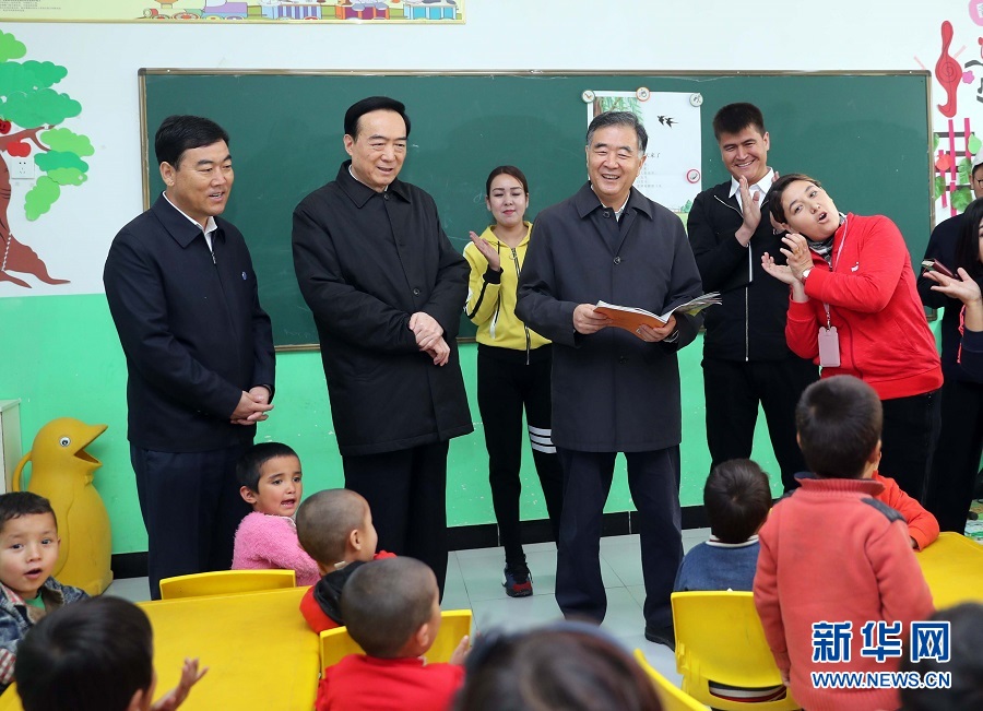 4月10日至14日,中共中央政治局常委、全国政协主席汪洋在新疆调研。这是4月11日,汪洋来到和田县村里的幼儿园看望孩子。 新华社记者刘卫兵 摄