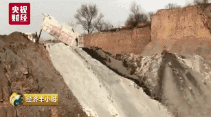 伴随着发动机的轰鸣声,卡车的后斗被抬起,一整车白色工业废渣被倾倒在一个巨大的深坑里,灰色和白色两种工业废渣沿着卡车停过的位置滚落至坑底,从远处看,好似两种不同颜色的“瀑布”。