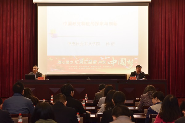 孙信教授以“‘五一口号’是新型政党制度和旧式政党制度的泾渭线”开篇,结合历史现实,运用大量实例,深入分析了中国多党制、一党制和国共合作失败的原因,详细介绍了中国共产党领导的多党合作和政治协商制度的产生、发展、特点和优势,使大家对中国新型政党制度有了更深刻的认识,更坚定了走中国特色社会主义政治发展道路的决心和信心。