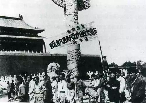 北平学生在天安门前举行“反饥饿、反内战”示威游行,得到了许多民主党派人士的响应