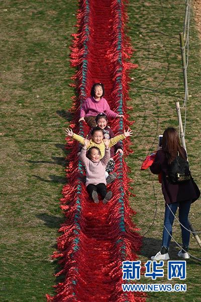 小朋友在湖州市吴兴区妙西镇原乡小镇体验滑草(3月10日摄)。新华社记者 黄宗治 摄
