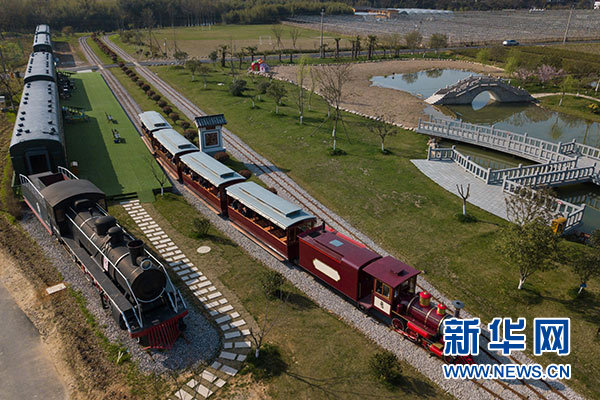 游客乘坐观光小火车从浙江省安吉县鲁家村的休闲驿站边驶过(3月23日无人机拍摄)。新华社记者 黄宗治 摄