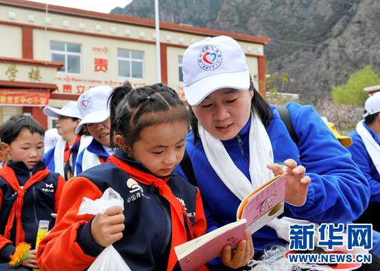 志愿者(右)在“共铸中国心·藏区手拉手”爱心助学活动现?。?月30日摄)。新华社发(王天摄)