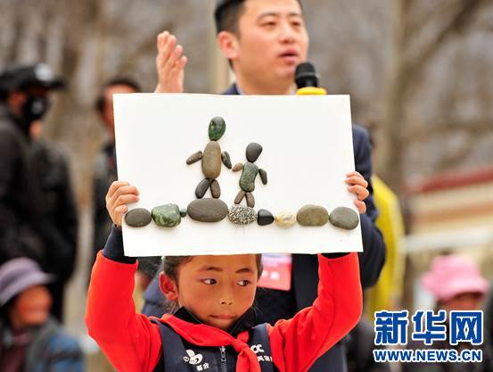 学生在“共铸中国心·藏区手拉手”爱心助学活动中展示手工拍卖作品(3月30日摄)。新华社发(王天摄)