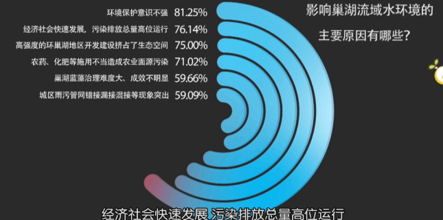 在多选题“影响巢湖流域水环境的主要原因有哪些”中,81.25%的网友选择“环境?;ひ馐恫磺俊?76.14%的网友选择“经济社会快速发展,污染排放总量高位运行”;75%的网友选择“高强度的环巢湖地区开发建设挤占了生态空间”;71.02%的网友选择“农药、化肥等施用不当造成农业面源污染”;59.66%的网友选择“巢湖蓝藻治理难度大、成效不明显”;59.09%的网友选择“城区雨污管网错接漏接混接等现象突出”。