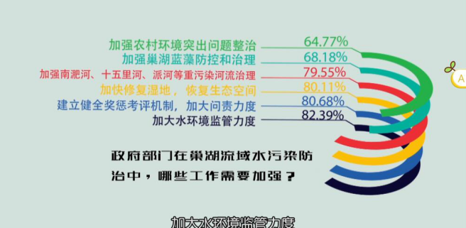 在回答“政府部门在巢湖流域水污染防治中,哪些工作需要加强?”这一问题时,82.39%的网友选择了“加大水环境监管力度”;80.68%的网友认为政府应“建立健全奖惩考评机制,加大问责力度”;80.11%的网友建议“加快修复湿地、恢复生态空间”;79.55%的网友认为应该“加强南淝河、十五里河、派河等重污染河流治理”;68.18%的网友认为要“加强巢湖蓝藻防控和治理”;64.77%的网友认为要“加强农村环境突出问题整治”。