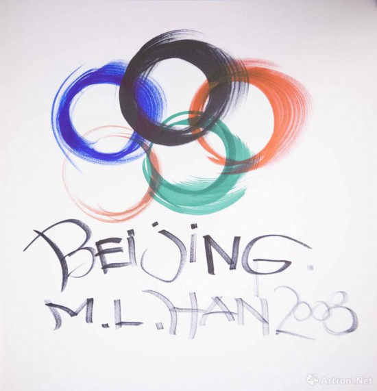 2001年北京申办奥运会,韩美林是申奥标志设计小组的主力成员。他用国画笔触重新演绎的奥运五环,环环相扣组成中国传统手工艺“中国结”的造型,将艺术与奥运的人文精神紧紧相连,而换个角度,整个标志又像极了中国特有的传统运动“太极拳”的基本姿势,经过极简单的变形又能呈现各式各样的运动项目。