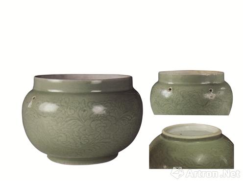 罐高15.6、口径18、足径12.8厘米。这件粥罐,形为直口,圆肩,鼓腹渐收,底为康熙特有的两层台式圈足。器身刻大叶缠枝牡丹纹,刀法娴熟,纹饰清晰。外罩青釉,釉汁匀净,色泽青绿。器内白釉坚致、披光感强并多棕眼。外底白釉下,暗划双栏圈,具有康熙瓷的典型风貌。此外,特别之处是胎釉交接处有锯齿痕现象。