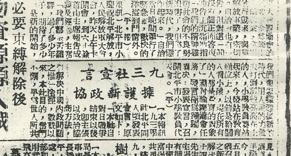 九三学社在北平新民报发表《拥护中共“五一”号召暨毛泽东八项主张的宣言》影印件。