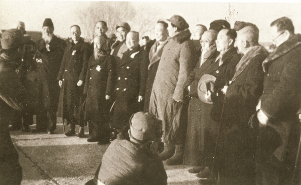 1949年3月25日下午,许德珩教授(右起第一人)与各民主党派负责人在西郊机场欢迎毛泽东主席