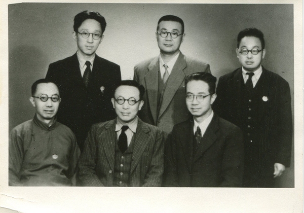 参加中国人民政治协商会议第一届全体会议的九三学社代表。左起:黎锦熙、许德珩、袁翰青。后排左起:叶丁易、吴藻溪、薛愚(叶丁易为候补代表)