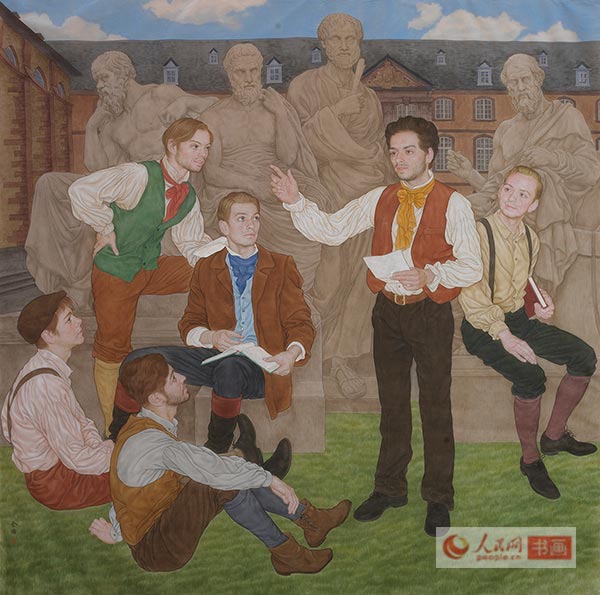 金瑞是本次创作最年轻的画家,年仅45岁。金瑞说道:这是我第一次接受这么重要的创作任务,中央领导对此非常重视。我创作的是马克思在家乡特里尔中学,那个时代马克思的影像资料非常缺乏,只找到一张画像,我为此还特别到北京语言大学找到了一位西班牙留学生来写生,长得和青年马克思很相像。在中学毕业时,马克思已经写出了关于人的理想的毕业论文,是一位有理想的青年学生。从当年的房屋建筑、服装,到马克思和他同学的年龄等都有考证。在塑造马克思形象上,我主要侧重在表现人物的睿智,在创作时,我的内心一直回荡着《国际歌》的旋律,默默感受着革命时代的气息。