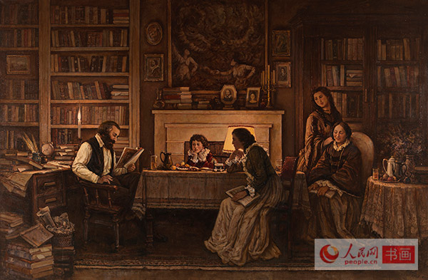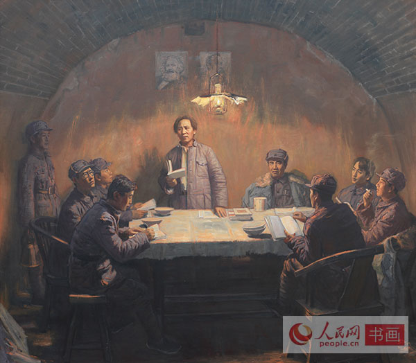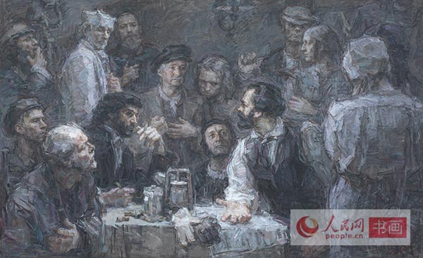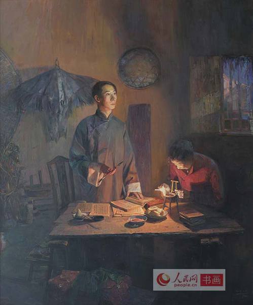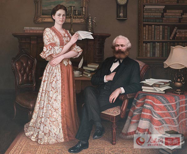 中央美院资深教授孙景波已年届74岁,是这批画家中年龄最大的。谈到这次在时间紧、任务重的情况下的创作时,他说道:我们这一代人是在读马克思主义高度的信仰下成长起来的,马克思诞生200年以来,特别是马克思主义产生以后,世界发生了天翻地覆的变化,马克思主义解放全人类,改在旧世界,建立世界大同的革命理想,仍然是我所信仰和追求的。这次我主动选择了画马克思一家人在书房朗读莎士比亚诗歌。表现了马克思作为学者、诗人、丈夫、父亲的一面。在艺术上,为了营造更为真切的时代气息,采用的是电灯发明之前烛光下充满明暗虚实神秘感和亲情的温馨,存托出一个书香家庭诗的意境。选择的时间节点是1865年马克思46岁,夫人50岁,长女燕妮20岁,二女儿劳拉19岁,幼女伊琳娜8-9岁全家相聚的时候,表现了马克思家庭完整、和睦,家教深厚。这张大作品创作尽管只有短短的2个月,是我既有自青年以来真情实感的创作储备,又有一定的创作经验来完成的精心之作。