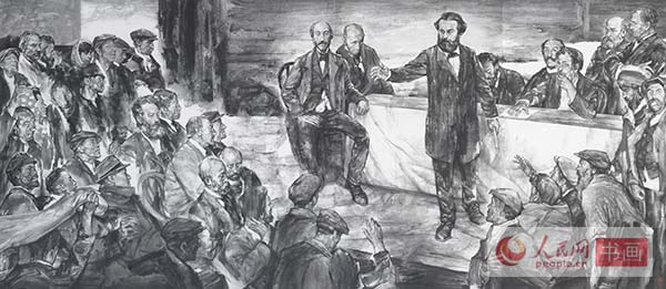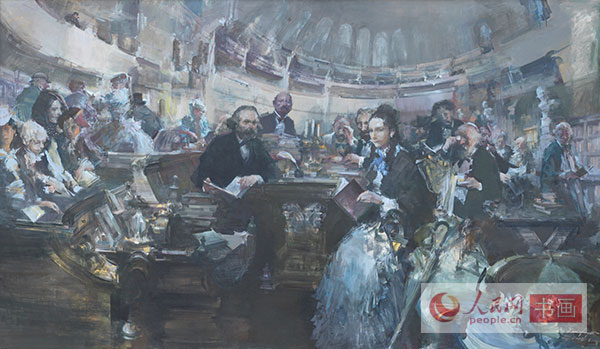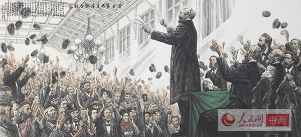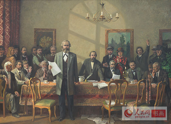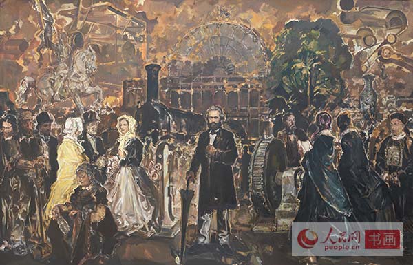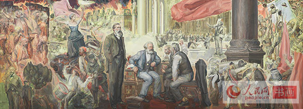 中国文联副主席、中央文史研究馆副馆长冯远是这次展览职务最高的艺术家,在繁忙的公务中,多年来他一直在画坛勤耕不缀。冯远的名作《世纪智者》中对马克思的塑造给人以深刻印象。冯远谈他这次的创作时说:马克思的思想学说指引并影响了中国革命和中国特色社会主义现代化建设,我是怀着景仰和尊崇的心意,以情景再现的方式、采用中国绘画的形式、语言和技法创作体现“全世界无产者联合起来”这一历史瞬间的宣言主题的。