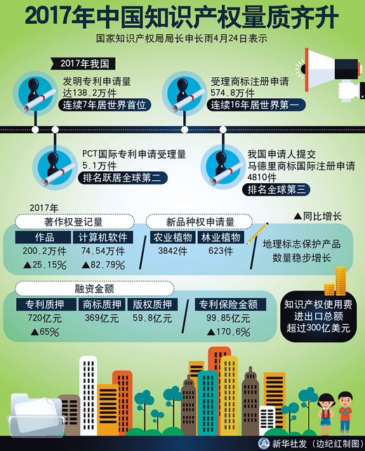 此前,习近平主席在博鳌亚洲论坛2018年年会开幕式上发表主旨演讲时指出,“加强知识产权保护。这是完善产权保护制度最重要的内容,也是提高中国经济竞争力最大的激励。”