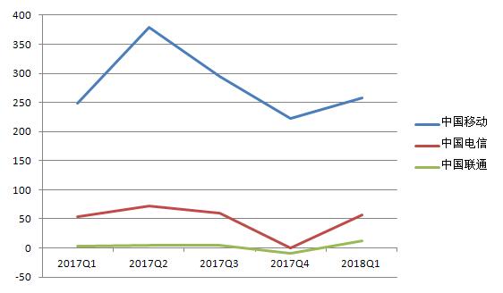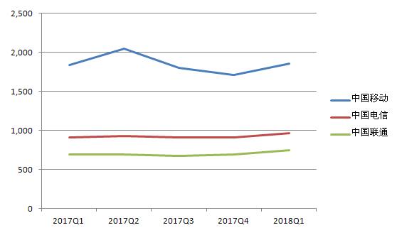 中国电信的营收除了在2017年Q3有所下降,基本处于稳步增长趋势。其2018年Q1的营收数据也在三大运营商中排中间。