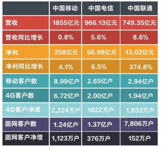 三大运营商在各方面皆呈增长态势。移动的营收、净利虽高,但其营收同比增长率仅为0.8%。联通的净利润同比增长率高达374.8%,营收同比增幅也是最高,混改成效显著。