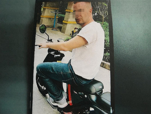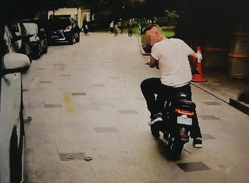 他连忙跑下楼,看到离停车点5米远处,一名外国男子正骑着他的电动自行车,用脚蹬地助力,缓慢前行。
