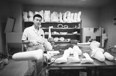 “传统制作模型的流程先取阴模、再修阴模,最后试阴模,需要在病患的残肢上进行调试?!弊抻胁咚担笔辈』继?,很多病患截肢的伤口未愈,根本无法在残肢上逐一调整,所以他们改进了制作方法,先在残肢上取阴模,根据阴模倒阳模,直接在阳模上修整制作残肢模型。小小的工作间,很快被大小长短不一的模型堆满。